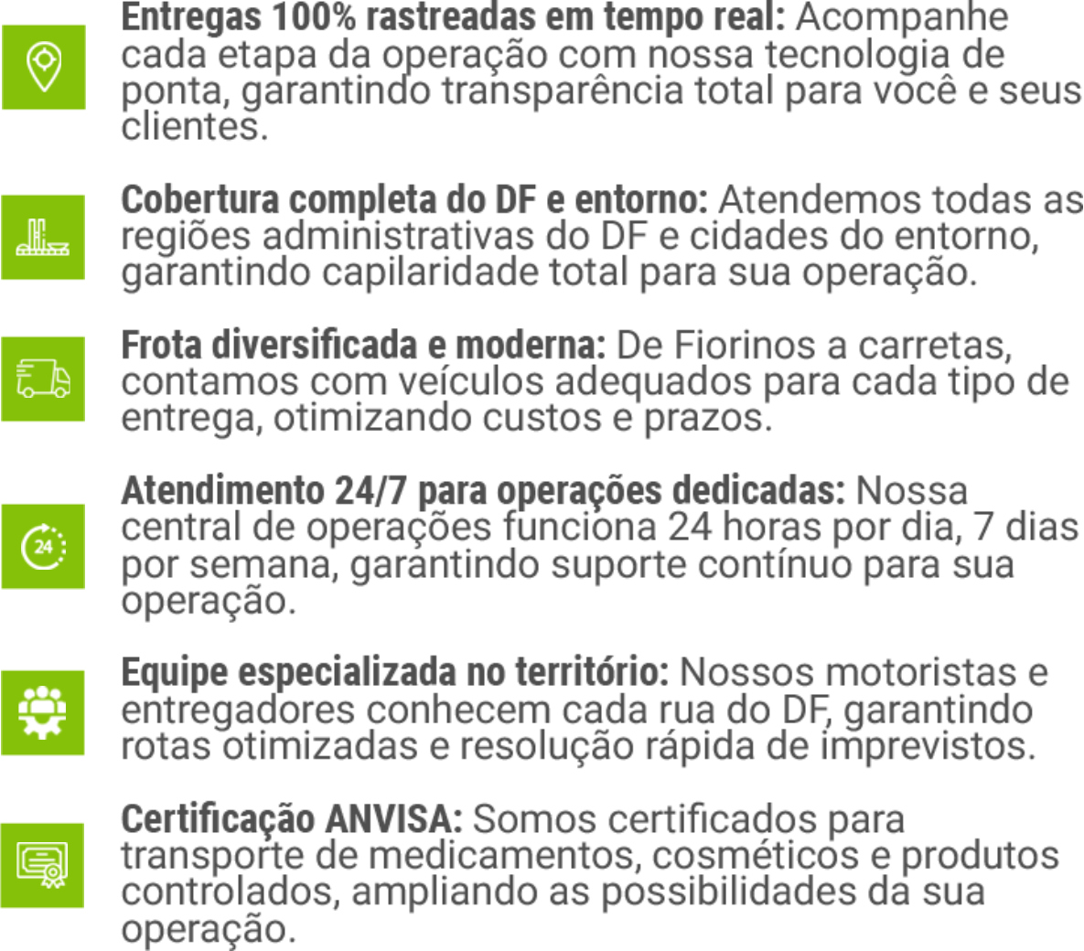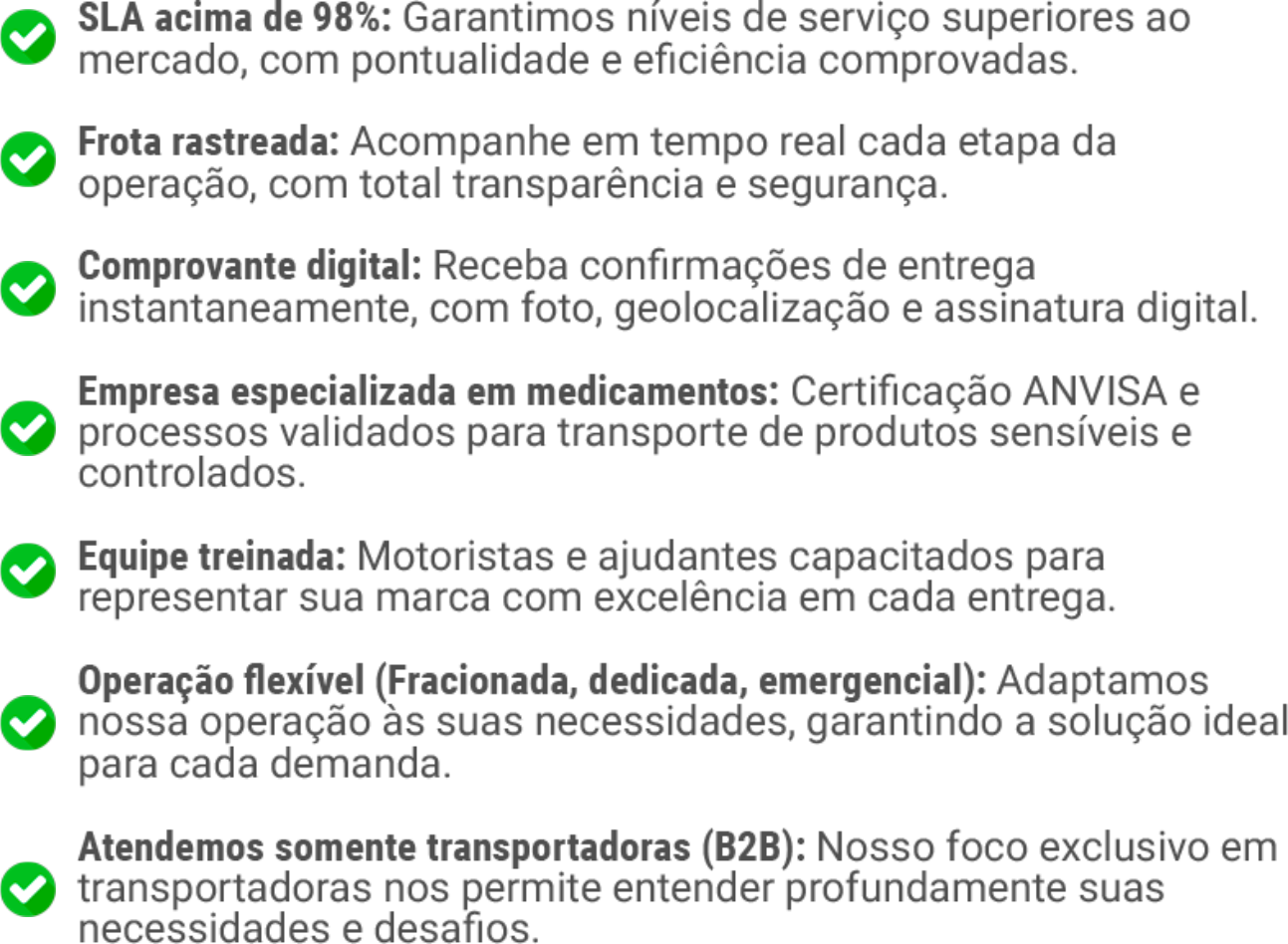 Com estrutura certificada pela ANVISA, frota rastreada e monitoramento 24/7, garantimos que sua operação no Distrito Federal funcione com a mesma qualidade e eficiência da sua matriz.